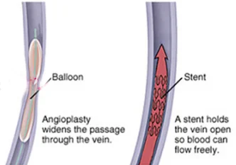 in bed without moving.  If the venogram shows an area of blockage, an angioplasty may be performed in an attempt to open up the area. This involves the insertion of a special tube, which has a tiny deflated balloon. The balloon is positioned at the site of the blockage and is then inflated. Following an angioplasty, if there still is not enough blood flow through the area of blockage, a metal mesh tube (stent) may be placed at the site. The stent will widen the vessel and improve the blood flow.